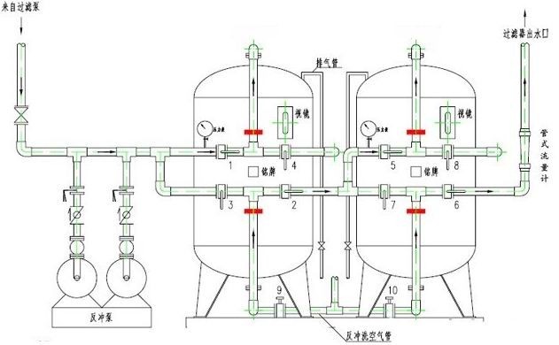10、當運行一個周期時要對濾料進行反沖洗或水質發(fā)生變化時應進行清洗濾料, 其方法按照操作規(guī)程進行,沖洗完畢化驗其水質合格后,再投入運行。