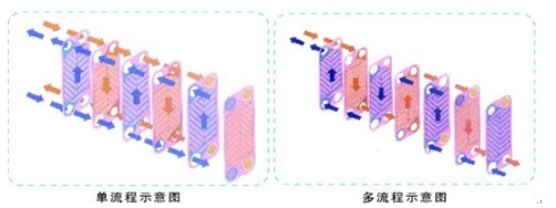 板式換熱器是由高效傳熱板片、密封膠墊、加緊螺栓及框架等主要部件組成。板片四個角開有角孔,鑲貼有密封膠墊的板片安裝在固定加緊板和活動加緊板之間的框架上,用加緊螺栓加緊,密封膠墊按人為設(shè)計的流程形式將各傳熱板片密封聯(lián)接,形成迷宮式的介質(zhì)流道,兩種換熱介質(zhì)在相鄰的流道內(nèi)互相逆流,形成充分的熱交換。傳熱板片用耐腐蝕金屬薄板壓制而成,波紋為人字型,相鄰板片具有反方向的人字型溝槽,溝槽的交叉點相互支撐形成接觸點,介質(zhì)流動時形成湍流狀態(tài),獲得很高的傳熱效率。