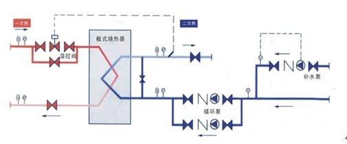 二次回水通過除污器后經(jīng)循環(huán)泵進(jìn)入板式換熱器,被蒸汽或一次高溫水加熱,蒸汽或一次高溫水進(jìn)入板式換熱器后,變成冷凝水回?zé)嵩刺?,形成二個獨立系統(tǒng),進(jìn)行間接換熱,補水泵將軟化水打入二次系統(tǒng)中維持壓力穩(wěn)定。